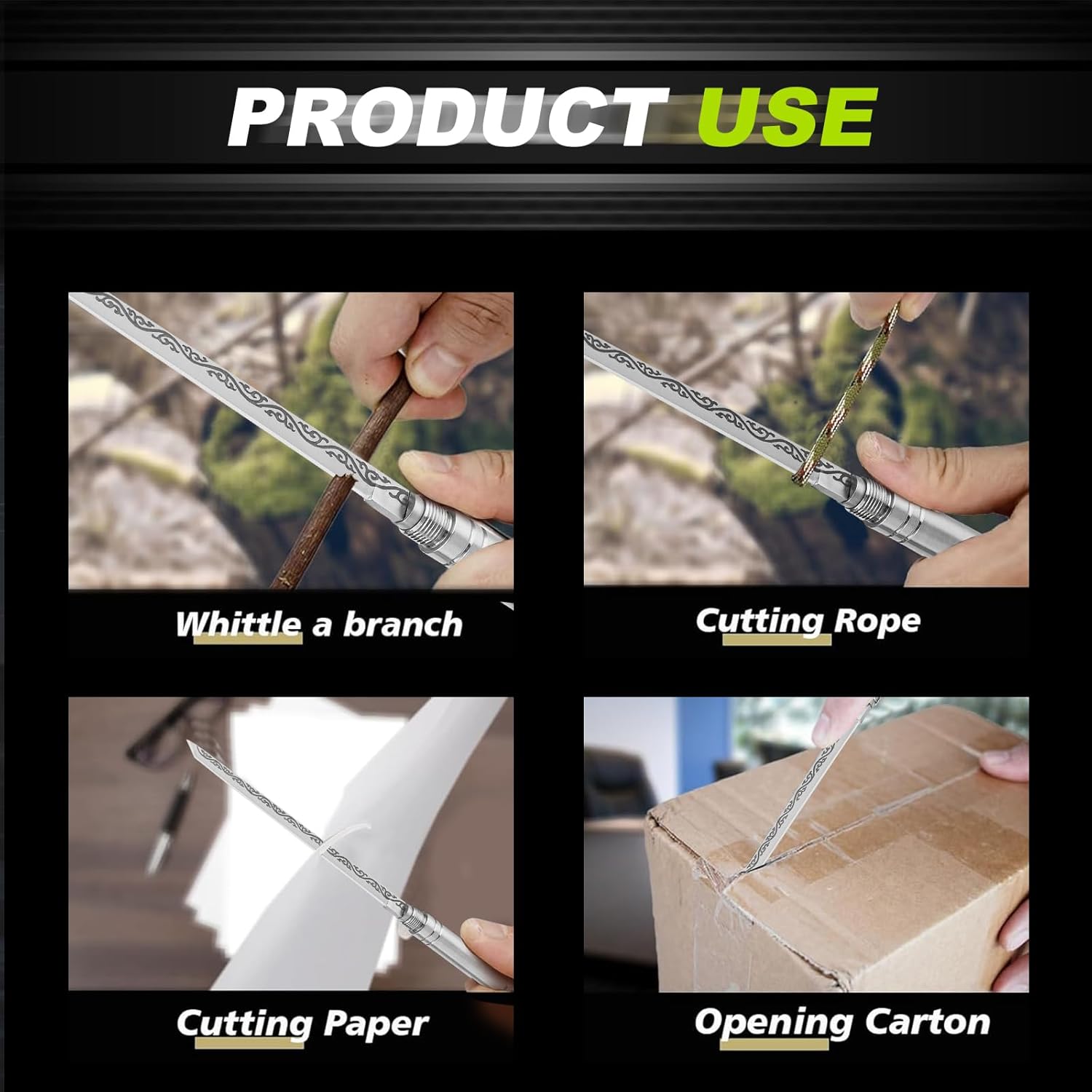 It’s great for everyday tasks like opening boxes, cutting tape, slicing rope, trimming small branches, and quick outdoor chores.
